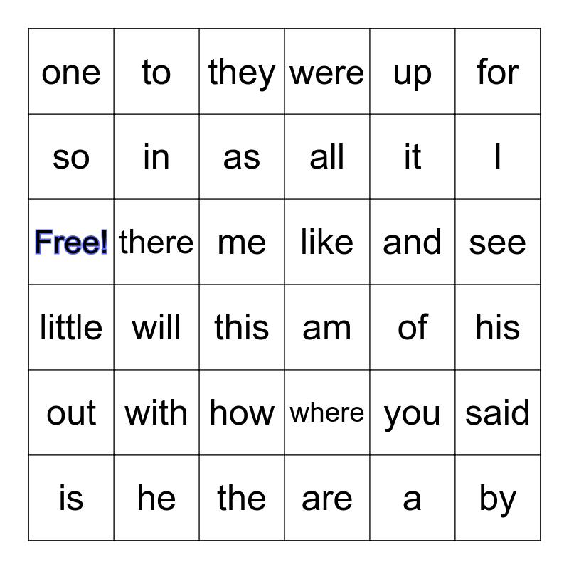 This bingo card has 36 words: where, how, are, so, little, like, in, the, up, you, I, were, said, there, all, one, out, and, Free!, they, me, will, am, this, of, to, it, he, as, for, by, is, his, see, with and a.