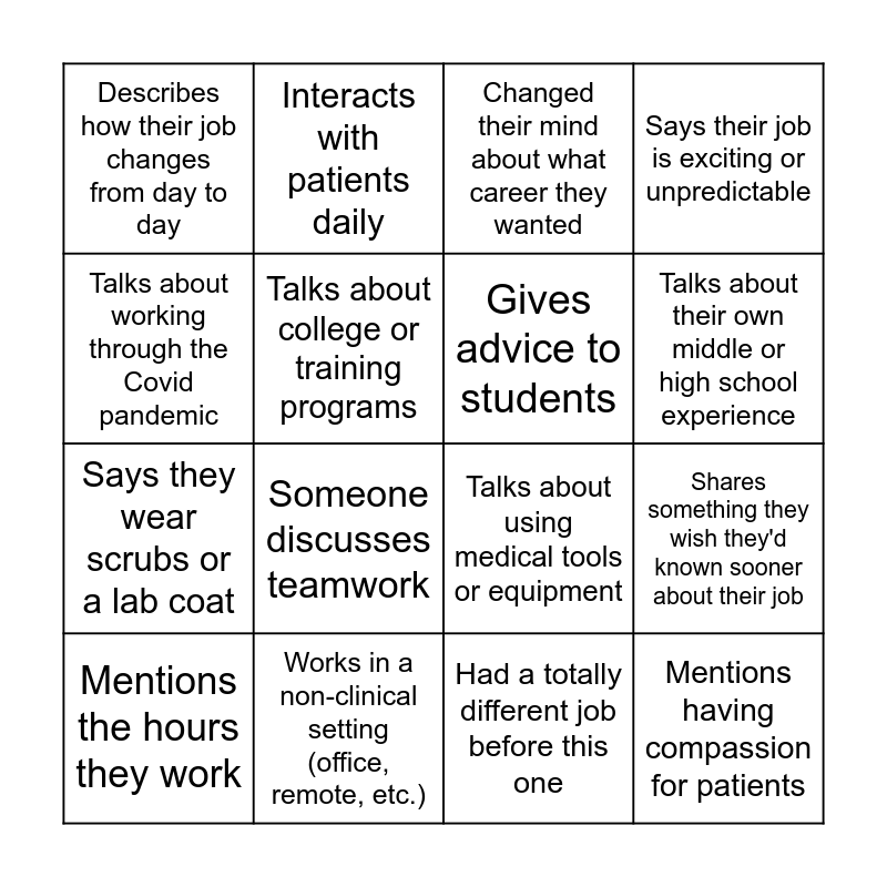 This bingo card has 27 words: Free!, Mentions why they love their job, Says they wear scrubs or a lab coat, Works in a hospital, clinic, or lab, Talks about college or training programs, Changed their mind about what career they wanted, Interacts with patients daily, Mentions having compassion for patients, Works in a non-clinical setting (office, remote, etc.), Mentions research in their work, Talks about using medical tools or equipment, Says their job is exciting or unpredictable, Uses computers or technology at work, Mentions needing to stay calm in emergencies, Someone discusses teamwork, Talks about mistakes they've learned from, Gives advice to students, Talks about their own middle or high school experience, Shares where they grew up or went to school, Describes how their job changes from day to day, Had a totally different job before this one, Mentions a certification test or exam they had to take, Shares something they wish they'd known sooner about their job, Mentions the hours they work, Discusses challenges of their job, Talks about working through the Covid pandemic and Says they went to Durham Public Schools.