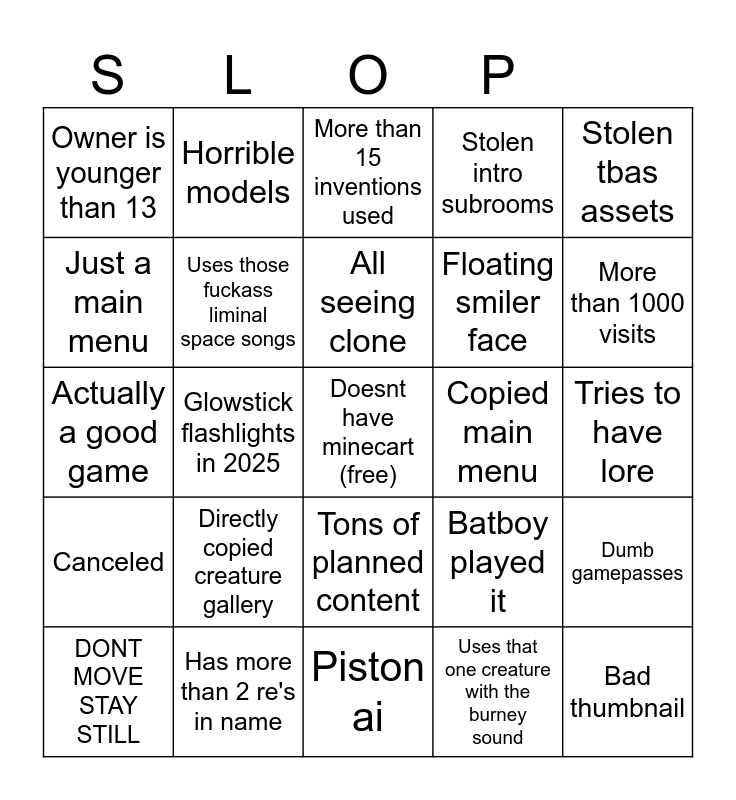This bingo card has a free space and 24 words: Directly copied creature gallery, Has more than 2 re's in name, All seeing clone, DONT MOVE STAY STILL, Stolen tbas assets, Owner is younger than 13, Just a main menu, Horrible models, Copied main menu, Tons of planned content, Floating smiler face, Actually a good game, Batboy played it, Dumb gamepasses, Uses those fuckass liminal space songs, Uses that one creature with the burney sound, Tries to have lore, More than 15 inventions used, More than 1000 visits, Glowstick flashlights in 2025, Bad thumbnail, Canceled, Stolen intro subrooms and Piston ai.