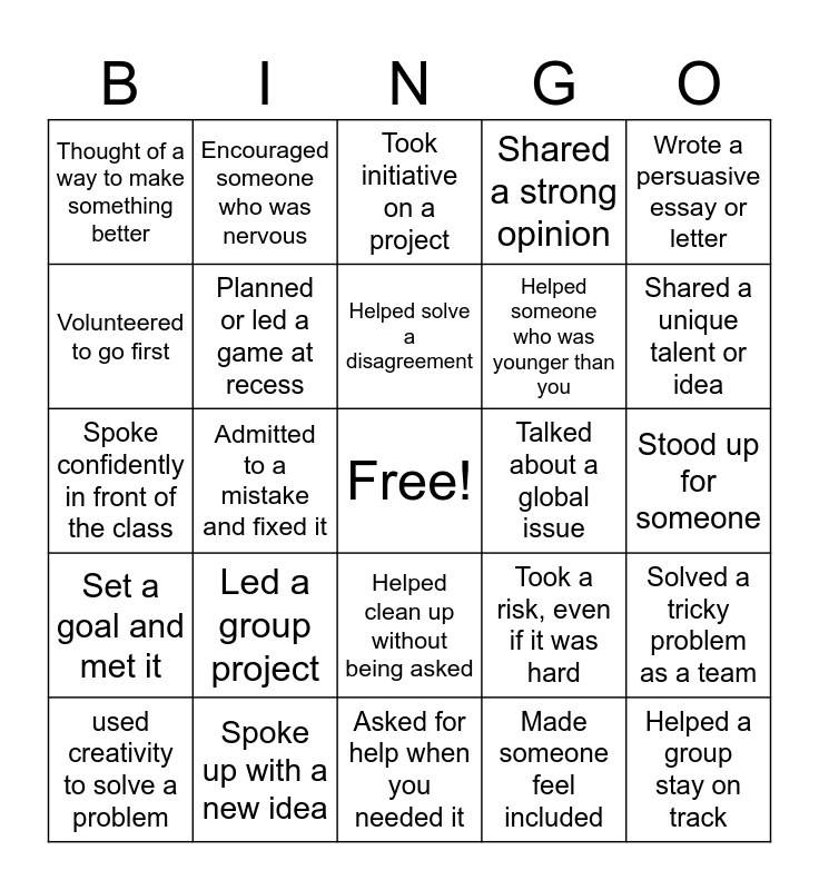 This bingo card has a free space and 24 words: Led a group project, Spoke up with a new idea, Helped solve a disagreement, used creativity to solve a problem, Wrote a persuasive essay or letter, Thought of a way to make something better, Volunteered to go first, Encouraged someone who was nervous, Talked about a global issue, Helped clean up without being asked, Helped someone who was younger than you, Spoke confidently in front of the class, Took a risk, even if it was hard, Solved a tricky problem as a team, Planned or led a game at recess, Made someone feel included, Stood up for someone, Took initiative on a project, Shared a unique talent or idea, Admitted to a mistake and fixed it, Helped a group stay on track, Set a goal and met it, Shared a strong opinion and Asked for help when you needed it.