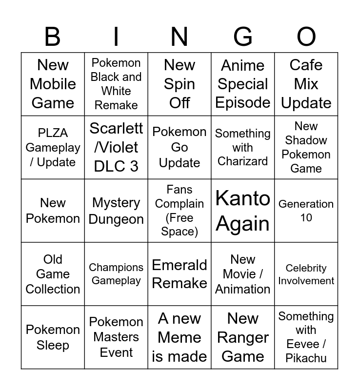 This bingo card has a free space and 24 words: Champions Gameplay, Pokemon Masters Event, Pokemon Go Update, Pokemon Sleep, Cafe Mix Update, New Mobile Game, PLZA Gameplay / Update, Pokemon Black and White Remake, Kanto Again, Emerald Remake, Something with Charizard, New Pokemon, New Movie / Animation, Celebrity Involvement, Scarlett /Violet DLC 3, New Ranger Game, Generation 10, New Spin Off, New Shadow Pokemon Game, Mystery Dungeon, Something with Eevee / Pikachu, Old Game Collection, Anime Special Episode and A new Meme is made.