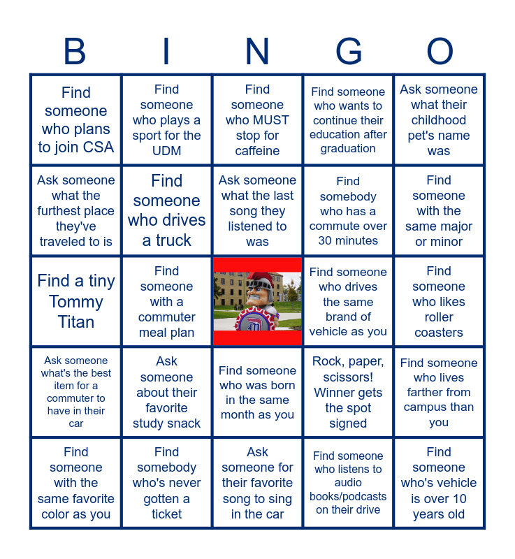 This bingo card has a free space and 24 words: Ask someone about their favorite study snack, Find somebody who's never gotten a ticket, Ask someone what the last song they listened to was, Find someone with the same favorite color as you, Ask someone what their childhood pet's name was, Find someone who plans to join CSA, Ask someone what the furthest place they've traveled to is, Find someone who plays a sport for the UDM, Find someone who drives the same brand of vehicle as you, Find someone who was born in the same month as you, Find somebody who has a commute over 30 minutes, Find a tiny Tommy Titan, Rock, paper, scissors! Winner gets the spot signed, Find someone who lives farther from campus than you, Find someone who drives a truck, Find someone who listens to audio books/podcasts on their drive, Find someone who likes roller coasters, Find someone who MUST stop for caffeine, Find someone with the same major or minor, Find someone with a commuter meal plan, Find someone who's vehicle is over 10 years old, Ask someone what's the best item for a commuter to have in their car, Find someone who wants to continue their education after graduation and Ask someone for their favorite song to sing in the car.