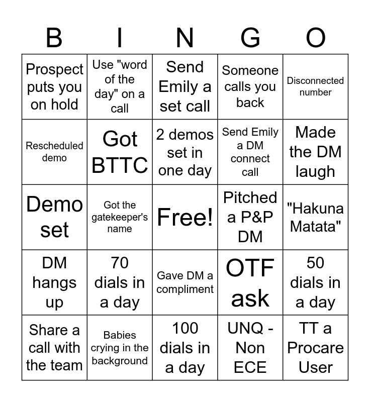 This bingo card has a free space and 24 words: 70 dials in a day, Babies crying in the background, 2 demos set in one day, Share a call with the team, Disconnected number, Prospect puts you on hold, Rescheduled demo, Use "word of the day" on a call, Pitched a P&P DM, Gave DM a compliment, Send Emily a DM connect call, Demo set, OTF ask, 50 dials in a day, Got BTTC, UNQ - Non ECE, "Hakuna Matata", Send Emily a set call, Made the DM laugh, Got the gatekeeper's name, TT a Procare User, DM hangs up, Someone calls you back and 100 dials in a day.
