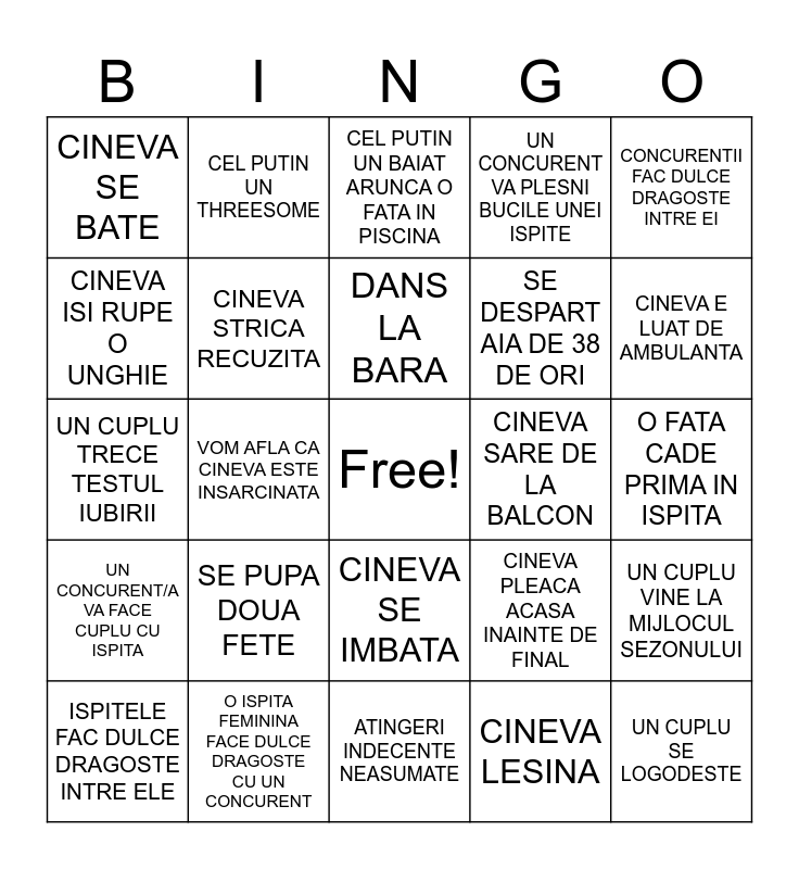 This bingo card has a free space and 24 words: SE PUPA DOUA FETE, O ISPITA FEMININA FACE DULCE DRAGOSTE CU UN CONCURENT, DANS LA BARA, ISPITELE FAC DULCE DRAGOSTE INTRE ELE, CONCURENTII FAC DULCE DRAGOSTE INTRE EI, CINEVA SE BATE, CINEVA ISI RUPE O UNGHIE, CEL PUTIN UN THREESOME, CINEVA SARE DE LA BALCON, CINEVA SE IMBATA, SE DESPART AIA DE 38 DE ORI, UN CUPLU TRECE TESTUL IUBIRII, CINEVA PLEACA ACASA INAINTE DE FINAL, UN CUPLU VINE LA MIJLOCUL SEZONULUI, CINEVA STRICA RECUZITA, CINEVA LESINA, O FATA CADE PRIMA IN ISPITA, CEL PUTIN UN BAIAT ARUNCA O FATA IN PISCINA, CINEVA E LUAT DE AMBULANTA, VOM AFLA CA CINEVA ESTE INSARCINATA, UN CUPLU SE LOGODESTE, UN CONCURENT/A VA FACE CUPLU CU ISPITA, UN CONCURENT VA PLESNI BUCILE UNEI ISPITE and ATINGERI INDECENTE NEASUMATE.