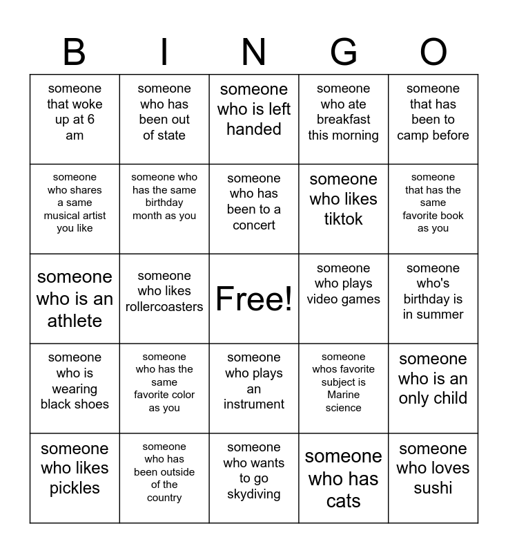 This bingo card has a free space and 24 words: someone who has the same favorite color as you, someone who has been outside of the country, someone who has been to a concert, someone who likes pickles, someone that has been to camp before, someone that woke up at 6 am, someone who shares a same musical artist you like, someone who has been out of state, someone who plays video games, someone who plays an instrument, someone who likes tiktok, someone who is an athlete, someone whos favorite subject is Marine science, someone who is an only child, someone who has the same birthday month as you, someone who has cats, someone who's birthday is in summer, someone who is left handed, someone that has the same favorite book as you, someone who likes rollercoasters, someone who loves sushi, someone who is wearing black shoes, someone who ate breakfast this morning and someone who wants to go skydiving.