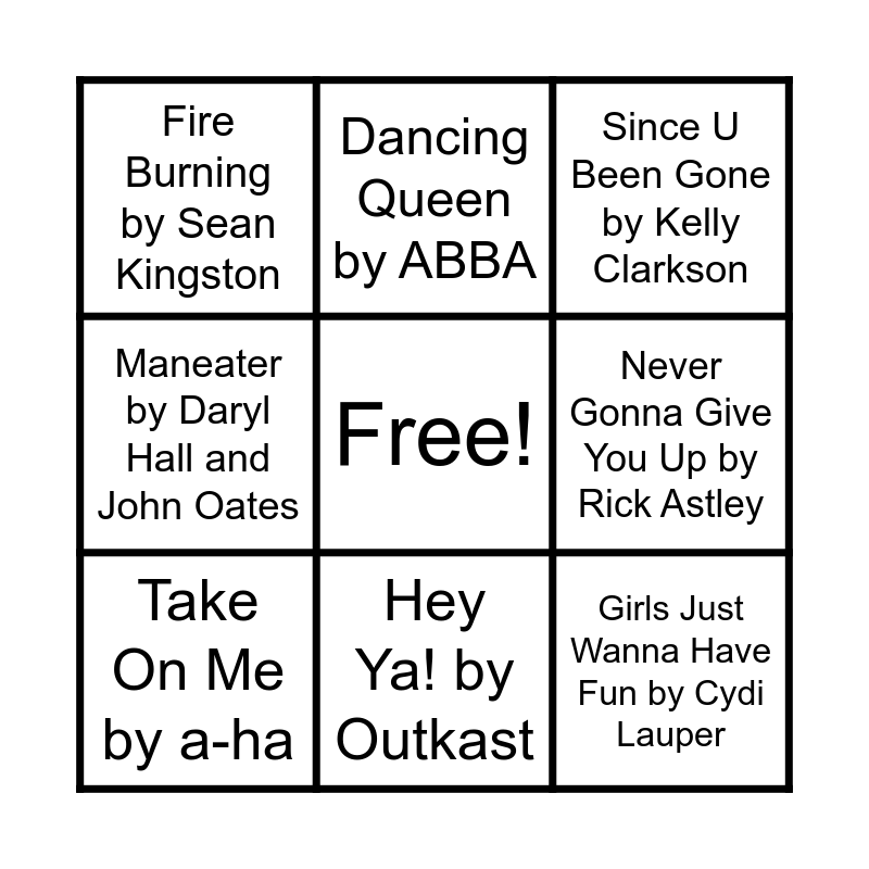 This bingo card has a free space and 36 words: Don't Stop Believin' by Journey, I Wanna Dance with Somebody by Whitney Houston, ...Baby One More Time by Britney Spears, Take On Me by a-ha, Gimme! Gimme! Gimme! by ABBA, We Didn't Start the Fire by Billy Joel, Hey Ya! by Outkast, Single Ladies by Beyoncé, Girls Just Wanna Have Fun by Cydi Lauper, I'm Still Standing by Elton John, Livin' la Vida Loca by Ricky Martin, Maneater by Daryl Hall and John Oates, Life is a Highway by Rascal Flatts, Only Girl (In the World) by Rihanna, Love Never Felt So Good by Michael Jackson, Fire Burning by Sean Kingston, Bad Blood by Taylor Swift, Last Friday Night by Katy Perry, Bad Romance by Lady Gaga, Since U Been Gone by Kelly Clarkson, I Love Rock 'N Roll by Joan Jett & The Blackhearts, Hooked on a Feeling by Blue Swede and Bjorn Skifs, You Belong with Me by Taylor Swift, Drops of Jupiter (Tell Me) by Train, thank u, next by Ariana Grande, Dancing Queen by ABBA, Wannabe by Spice Girls, Africa by TOTO, I Want it That Way by Backstreet Boys, Never Gonna Give You Up by Rick Astley, Uptown Funk by Bruno Mars, I'm Gonna Be (500 Miles) by The Proclaimers, Forget You by Ceelo Green, Livin' On A Prayer by Bon Jovi, Billie Jean by Michael Jackson and 9 to 5 by Dolly Parton.
