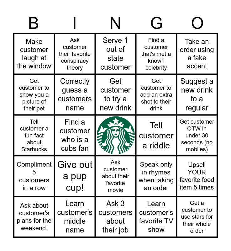 This bingo card has a free space and 24 words: Give out a pup cup!, Learn customer's middle name, Get customer to try a new drink, Ask about customer's plans for the weekend., Take an order using a fake accent, Make customer laugh at the window, Get customer to show you a picture of their pet, Ask customer their favorite conspiracy theory, Tell customer a riddle, Ask customer about their favorite movie, Get customer to add an extra shot to their drink, Tell customer a fun fact about Starbucks, Speak only in rhymes when taking an order, Upsell YOUR favorite food item 5 times, Correctly guess a customers name, Learn customer's favorite TV show, Get customer OTW in under 30 seconds (no mobiles), Serve 1 out of state customer, Suggest a new drink to a regular, Find a customer who is a cubs fan, Get a customer to use stars for their whole order, Compliment 5 customers in a row, Find a customer that's met a known celebrity and Ask 3 customers about their job.