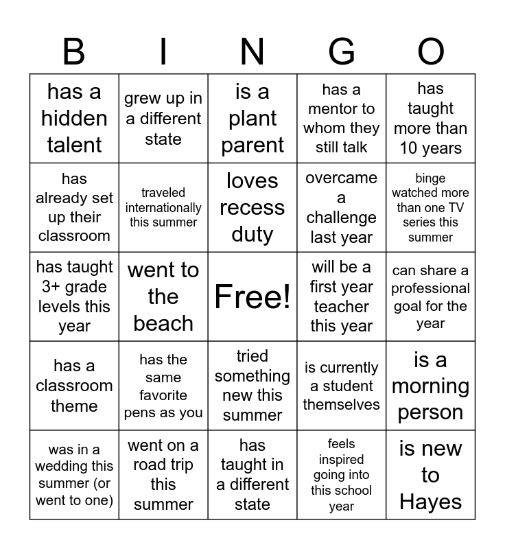 This bingo card has a free space and 24 words: has the same favorite pens as you, went on a road trip this summer, loves recess duty, was in a wedding this summer (or went to one), has taught more than 10 years, has a hidden talent, has already set up their classroom, grew up in a different state, will be a first year teacher this year, tried something new this summer, overcame a challenge last year, has taught 3+ grade levels this year, is currently a student themselves, is a morning person, traveled internationally this summer, feels inspired going into this school year, can share a professional goal for the year, is a plant parent, binge watched more than one TV series this summer, went to the beach, is new to Hayes, has a classroom theme, has a mentor to whom they still talk and has taught in a different state.