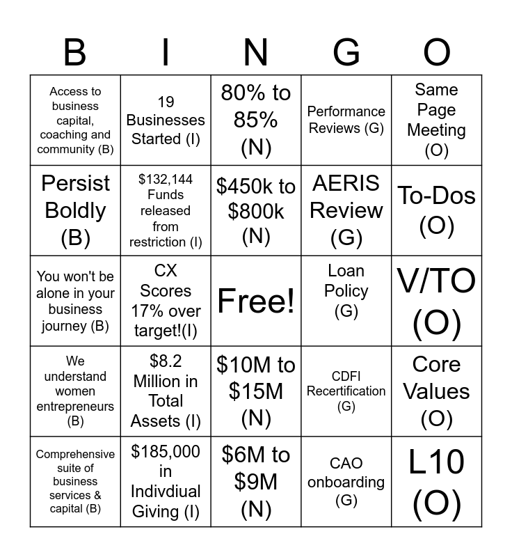 This bingo card has a free space and 49 words: Make Meaningful Change (B), 86% Rock Completion (I), $5.4 to $6.2 Million (N), CAO onboarding (G), V/TO (O), Engage with Empathy (B), 19 Businesses Started (I), 75 to 100 (N), AERIS Review (G), Scorecards (O), Persist Boldly (B), CX Scores 17% over target!(I), CDFI Recertification (G), L10 (O), To elevate women (B), $4.378 Million in Active Loan Portfolio (I), 80% to 85% (N), Loan Policy (G), Quarterly Conversation (O), Access to business capital, coaching and community (B), $185,000 in Indivdiual Giving (I), $6M to $9M (N), Performance Reviews (G), Same Page Meeting (O), $15M in our active loan portfolio & impacted the lives of 10,000 women since 2020 (B), $8.2 Million in Total Assets (I), $450k to $800k (N), Product/Services Roadmap (G), Core Values (O), We understand women entrepreneurs (B), over $400,000 in Corp/Foundation Grants (I), $10M to $15M (N), Client Success Strategy Training (G), Core Focus (O), Comprehensive suite of business services & capital (B), 5805 Women's Lives Impacted (I), $500k to $800k (N), Company Rocks (G), To-Dos (O), A like-minded community (B), 377 Jobs Created (I), 6,500 to 8,500 (N), Goal is 80% (G), Rocks (O), You won't be alone in your business journey (B), $132,144 Funds released from restriction (I), 1,000 to 1,500 (N), Ontrack Offtrack Complete (G) and Issues (O).