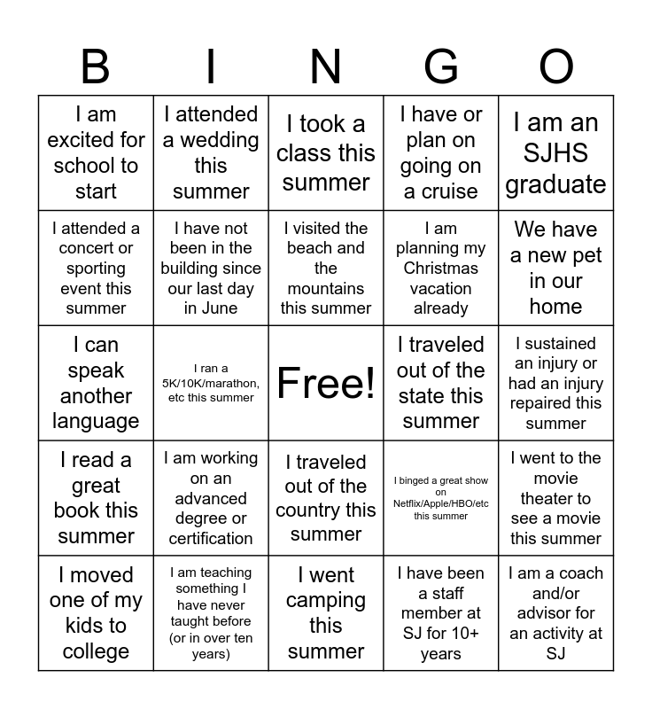 This bingo card has a free space and 29 words: I moved one of my kids to college, I did not set an alarm all summer, I ran a 5K/10K/marathon, etc this summer, I completed a major home project this summer, I am excited for school to start, I took a class this summer, I have not been in the building since our last day in June, I am working on an advanced degree or certification, I traveled out of the state this summer, I am teaching something I have never taught before (or in over ten years), I sustained an injury or had an injury repaired this summer, I am a coach and/or advisor for an activity at SJ, I went camping this summer, I have been a staff member at SJ for 10+ years, We have a new pet in our home, I spent time with my family this summer, I traveled out of the country this summer, I read a great book this summer, I am an SJHS graduate, I can speak another language, I binged a great show on Netflix/Apple/HBO/etc this summer, I have been to the pool this year, I am planning my Christmas vacation already, I attended a concert or sporting event this summer, I have or plan on going on a cruise, I attended a wedding this summer, I went to the movie theater to see a movie this summer, I visited the beach and the mountains this summer and I sold something I made this summer.