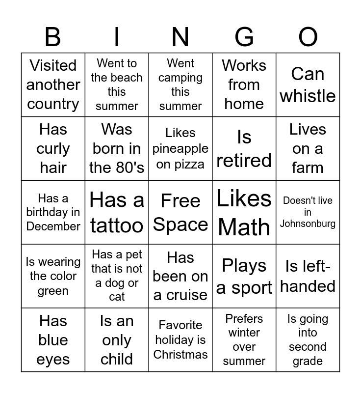 This bingo card has a free space and 24 words: Has a pet that is not a dog or cat, Is an only child, Likes pineapple on pizza, Has blue eyes, Can whistle, Visited another country, Has curly hair, Went to the beach this summer, Likes Math, Has been on a cruise, Is retired, Has a birthday in December, Plays a sport, Is left- handed, Was born in the 80's, Prefers winter over summer, Doesn't live in Johnsonburg, Went camping this summer, Lives on a farm, Has a tattoo, Is going into second grade, Is wearing the color green, Works from home and Favorite holiday is Christmas.
