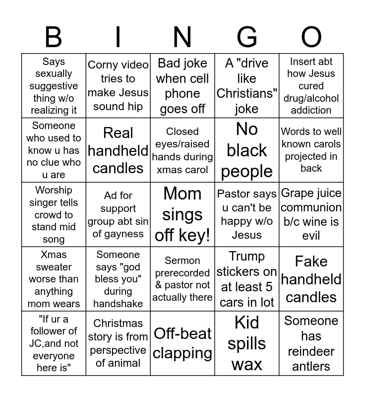 This bingo card has a free space and 24 words: Someone says "god bless you" during handshake, Christmas story is from perspective of animal, Closed eyes/raised hands during xmas carol, "If ur a follower of JC,and not everyone here is", Insert abt how Jesus cured drug/alcohol addiction, Says sexually suggestive thing w/o realizing it, Someone who used to know u has no clue who u are, Corny video tries to make Jesus sound hip, Pastor says u can't be happy w/o Jesus, Sermon prerecorded & pastor not actually there, No black people, Worship singer tells crowd to stand mid song, Trump stickers on at least 5 cars in lot, Fake handheld candles, Real handheld candles, Kid spills wax, Grape juice communion b/c wine is evil, Bad joke when cell phone goes off, Words to well known carols projected in back, Ad for support group abt sin of gayness, Someone has reindeer antlers, Xmas sweater worse than anything mom wears, A "drive like Christians" joke and Off-beat clapping.