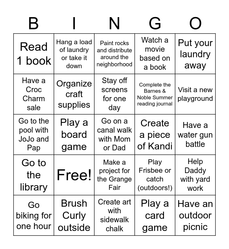 This bingo card has a free space and 24 words: Free!, Brush Curly outside, Stay off screens for one day, Go biking for one hour, Put your laundry away, Read 1 book, Have a Croc Charm sale, Hang a load of laundry or take it down, Create a piece of Kandi, Make a project for the Grange Fair, Complete the Barnes & Noble Summer reading journal, Go to the pool with JoJo and Pap, Play Frisbee or catch (outdoors!), Help Daddy with yard work, Organize craft supplies, Play a card game, Have a water gun battle, Paint rocks and distribute around the neighborhood, Visit a new playground, Play a board game, Have an outdoor picnic, Go to the library, Watch a movie based on a book and Create art with sidewalk chalk.