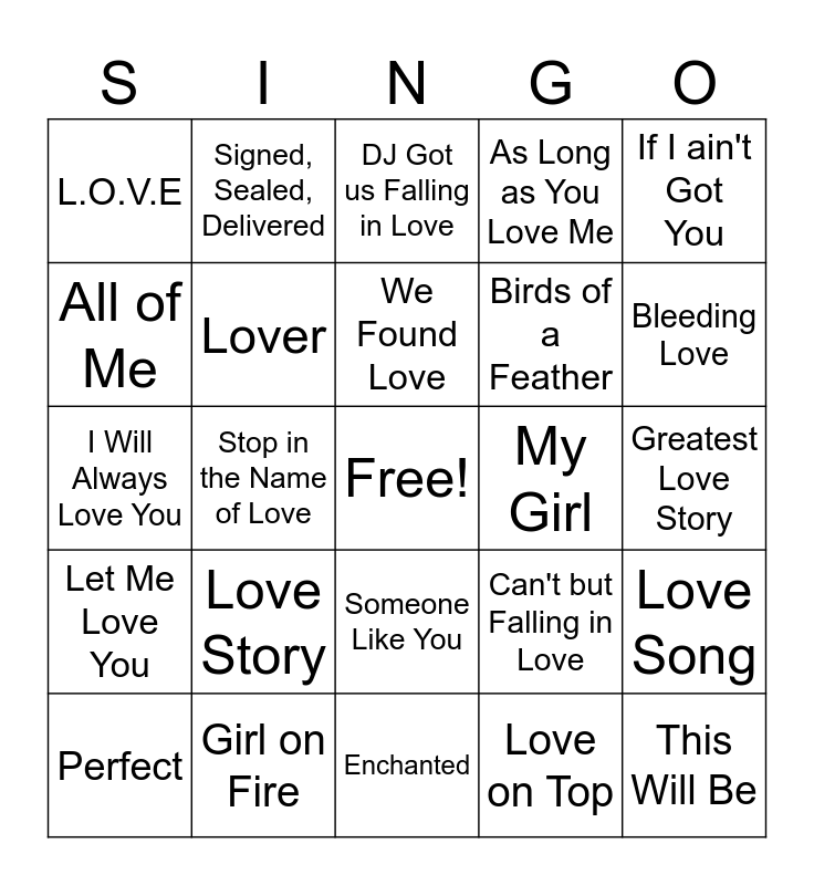 This bingo card has a free space and 24 words: Love Story, Girl on Fire, We Found Love, Perfect, If I ain't Got You, L.O.V.E, All of Me, Signed, Sealed, Delivered, My Girl, Someone Like You, Birds of a Feather, I Will Always Love You, Can't but Falling in Love, Love Song, Lover, Love on Top, Greatest Love Story, DJ Got us Falling in Love, Bleeding Love, Stop in the Name of Love, This Will Be, Let Me Love You, As Long as You Love Me and Enchanted.