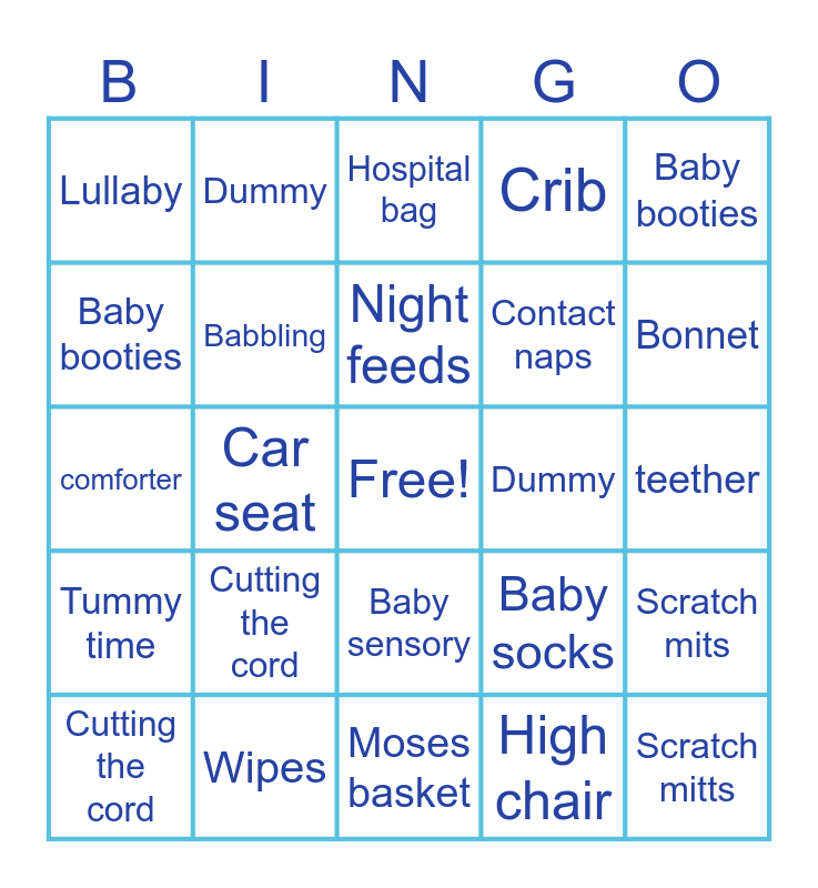 This bingo card has a free space and 53 words: Stair gate, Scratch mitts, Baby socks, High chair, Cutting the cord, Night feeds, Dummy, Sudocrem, Baby booties, Car seat, Babbling, Stair gate, Scratch mits, Baby socks, High chair, Cutting the cord, Night feeds, Dummy, Sudacrem, Baby booties, Car seat, Babbling, Contact naps, Lullaby, Baby grow, Wipes, Blanket, Crawling, Nappy bags, Bonnet, Nappy, Bouncer, Baby bath, Baby yoga, Snot sucker, Epidural, Crib, Moses basket, Hospital bag, Baby massage, Muslin cloth, Changing bag, teether, rattle, Baby shampoo, Baby sensory, Rocking chair, nursery, comforter, Tummy time, Skin to skin, stroller and wind.