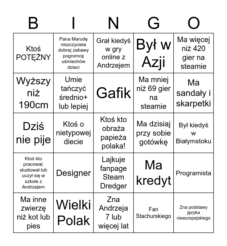 This bingo card has a free space and 38 words: Zna 5 lub więcej Andrzejów, NIE grał w disco elysium, Ktoś łysy, Umie tańczyć średnio+ lub lepiej, Programista, Designer, Gafik, Ktoś z gamedevową profesją (inną niż designer, programista lub grafik), Ma więcej niż 420 gier na steamie, Ma mniej niż 69 gier na steamie, Ktoś o nietypowej diecie, Był w Azji, Zna podstawy języka nieeuropejskiego, Był kiedyś w Białymstoku, Wyższy niż 190cm, Ktoś kto pracował, studiował lub uczył się w szkole z Andrzejem, Magister lub DOKTOR NAUK, Grał kiedyś w gry online z Andrzejem, Gra/grał w Magic the Gathering., Ma dzisiaj przy sobie gotówkę, Ktoś POTĘŻNY, Wielki Polak, Ma sandały i skarpetki, Ma inne zwierzę niż kot lub pies, Był kiedyś w saunie, Zna Andrzeja 7 lub więcej lat, Ktoś rudy, Ulubiony pokemon jest typu Water, Woli bepis niż conk, Umie liczyć całki, Pokonał serce w Slay the Spire, Lajkuje fanpage Steam Dredger, Fan Stachurskiego, Pana Marudę niszczyciela dobrej zabawy pogromcę uśmiechów dzieci, Przyszedł z osobą towarzyszącą., Ma kredyt, Dziś nie pije and Pokonał Chińczyka z Uzi.