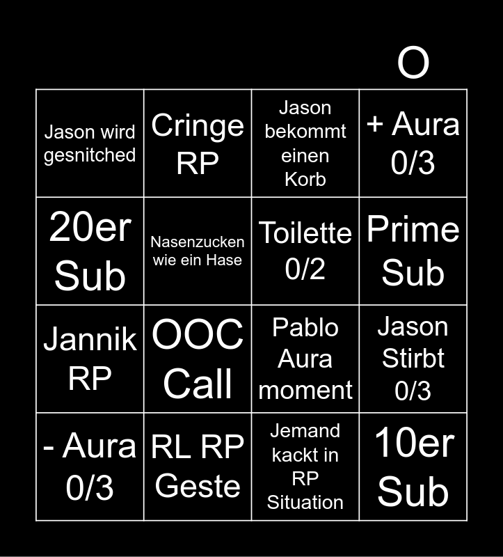 This bingo card has 16 words: RL RP Geste, Jason Stirbt 0/3, Jason bekommt einen Korb, Jason wird gesnitched, Jannik RP, Cringe RP, Pablo Aura moment, Jemand kackt in RP Situation, 20er Sub, Nasenzucken wie ein Hase, - Aura 0/3, + Aura 0/3, OOC Call, Prime Sub, Toilette 0/2 and 10er Sub.