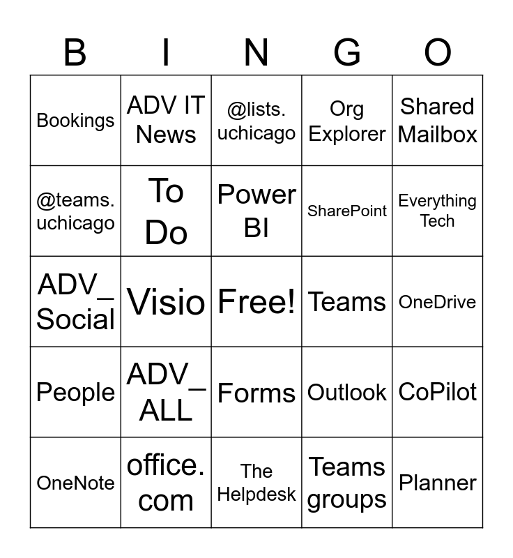 This bingo card has a free space and 28 words: CoPilot, Viva Engage, SharePoint, Teams groups, @teams. uchicago, @lists. uchicago, ADV IT News, People, Teams, OneNote, ADV_ Social, Org Explorer, office. com, The Helpdesk, Everything Tech, Lists, ADV_ ALL, To Do, Power BI, Forms, Bookings, Project, Planner, Visio, OneDrive, Outlook, Shared Mailbox and distribution lists.