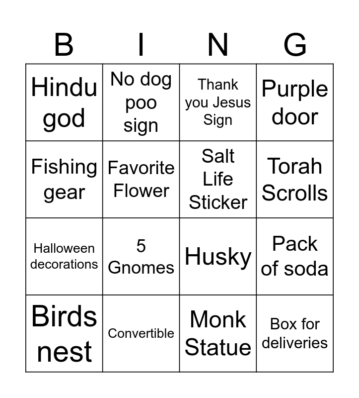 This bingo card has 24 words: S,H,Sp Statues, Pug, Torah Scrolls, Baby Sleeping Sign, Fishing gear, Hindu god, Favorite Flower, No dog poo sign, Convertible, French door, Halloween decorations, Husky, Basketball Hoop, Political Flyer, Salt Life Sticker, Christmas Doormat, Monk Statue, Thank you Jesus Sign, 5 Gnomes, Pack of soda, Birds nest, Box for deliveries, Purple door and Welcome (ish) Sign.