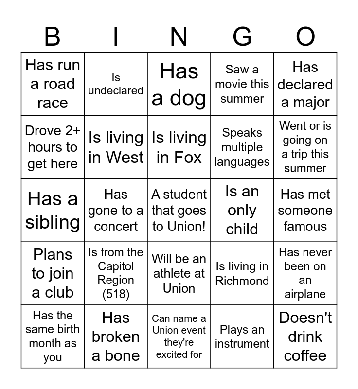 This bingo card has a free space and 24 words: Is from the Capitol Region (518), Has broken a bone, Is living in Fox, Has the same birth month as you, Has declared a major, Has run a road race, Drove 2+ hours to get here, Is undeclared, Is an only child, Will be an athlete at Union, Speaks multiple languages, Has a sibling, Is living in Richmond, Has never been on an airplane, Is living in West, Plays an instrument, Has met someone famous, Has a dog, Went or is going on a trip this summer, Has gone to a concert, Doesn't drink coffee, Plans to join a club, Saw a movie this summer and Can name a Union event they're excited for.
