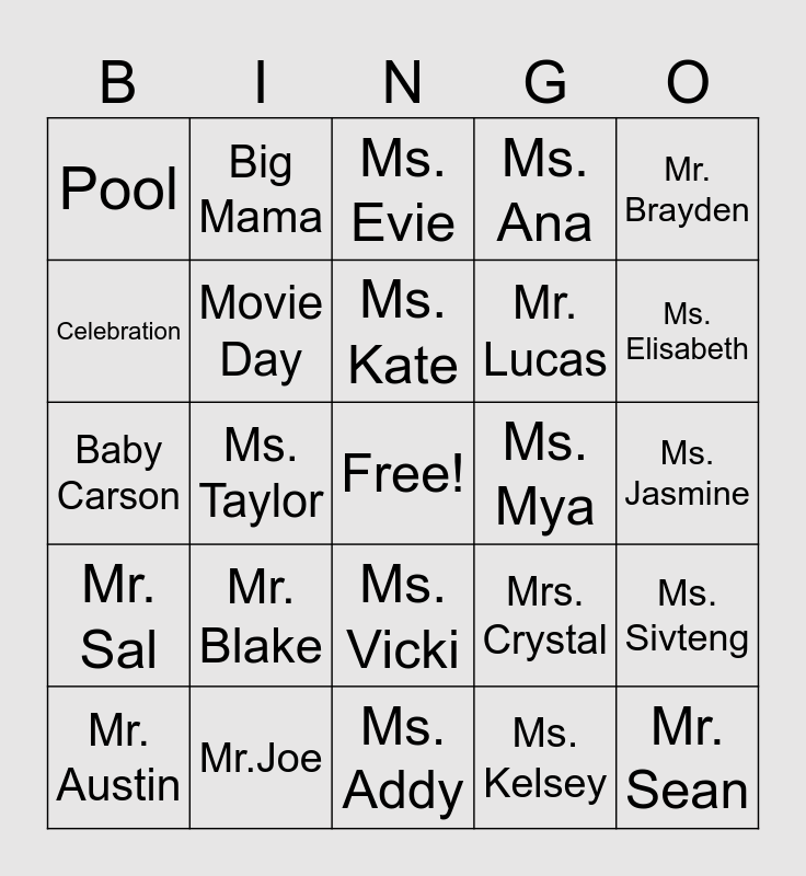 This bingo card has a free space and 30 words: Mr. Ben, Mr.Joe, Ms. Evie, Ms. Bailey, Mr. Brayden, Pool, Movie Day, Ms. Kate, Mr. Lucas, Mr. Sean, Mr. Austin, Mr. Blake, Ms. Kelsey, Mr. Caden, Mr. Sal, Ms. Joy, Ms. Addy, Ms. Mya, Ms. Sivteng, Celebration, Ms. Taylor, Chapel, Ms. Ana, Ms. Jasmine, Baby Carson, Big Mama, Ms. Vicki, Mrs. Crystal, Ms. Elisabeth and Ms. Carrie.