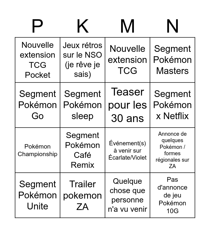 This bingo card has 16 words: Trailer pokemon ZA, Annonce de quelques Pokémon / formes régionales sur ZA, Nouvelle extension TCG, Nouvelle extension TCG Pocket, Pokémon Championship, Jeux rétros sur le NSO (je rêve je sais), Événement(s) à venir sur Écarlate/Violet, Quelque chose que personne n'a vu venir, Segment Pokémon Go, Segment Pokémon sleep, Segment Pokémon Unite, Segment Pokémon Masters, Segment Pokémon Café Remix, Segment Pokémon x Netflix, Teaser pour les 30 ans and Pas d'annonce de jeu Pokémon 10G.