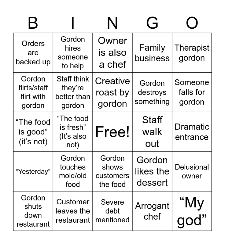 This bingo card has a free space and 24 words: Gordon touches mold/old food, Customer leaves the restaurant, Creative roast by gordon, Gordon shuts down restaurant, Therapist gordon, Orders are backed up, Gordon flirts/staff flirt with gordon, Gordon hires someone to help, Staff walk out, Gordon shows customers the food, Gordon destroys something, “The food is good” (it’s not), Gordon likes the dessert, Delusional owner, Staff think they’re better than gordon, Arrogant chef, Dramatic entrance, Owner is also a chef, Someone falls for gordon, “The food is fresh” (It’s also not), “My god”, “Yesterday”, Family business and Severe debt mentioned.