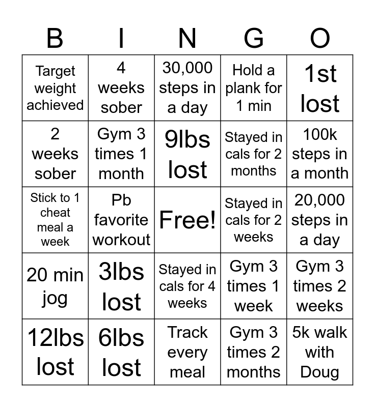 This bingo card has a free space and 24 words: 3lbs lost, 6lbs lost, 9lbs lost, 12lbs lost, 1st lost, Target weight achieved, 2 weeks sober, 4 weeks sober, Stayed in cals for 2 weeks, Stayed in cals for 4 weeks, Stayed in cals for 2 months, Stick to 1 cheat meal a week, Gym 3 times 1 week, Gym 3 times 2 weeks, Gym 3 times 1 month, Gym 3 times 2 months, 20,000 steps in a day, 30,000 steps in a day, 100k steps in a month, Pb favorite workout, 5k walk with Doug, 20 min jog, Hold a plank for 1 min and Track every meal.