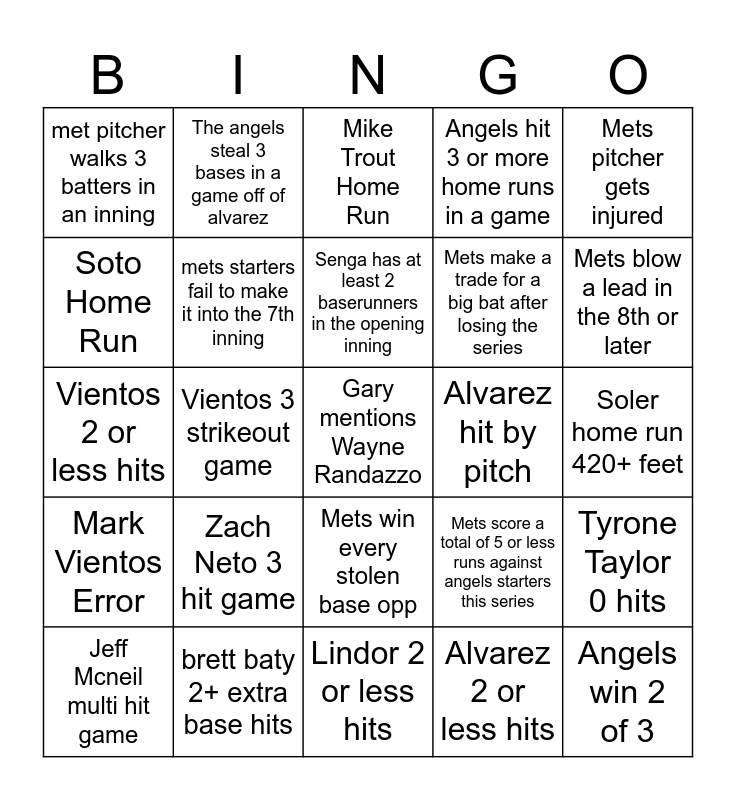 This bingo card has a free space and 24 words: Zach Neto 3 hit game, brett baty 2+ extra base hits, Senga has at least 2 baserunners in the opening inning, Jeff Mcneil multi hit game, Mets pitcher gets injured, met pitcher walks 3 batters in an inning, Soto Home Run, The angels steal 3 bases in a game off of alvarez, Alvarez hit by pitch, Mets win every stolen base opp, Mets make a trade for a big bat after losing the series, Vientos 2 or less hits, Mets score a total of 5 or less runs against angels starters this series, Tyrone Taylor 0 hits, mets starters fail to make it into the 7th inning, Alvarez 2 or less hits, Soler home run 420+ feet, Mike Trout Home Run, Mets blow a lead in the 8th or later, Vientos 3 strikeout game, Angels win 2 of 3, Mark Vientos Error, Angels hit 3 or more home runs in a game and Lindor 2 or less hits.