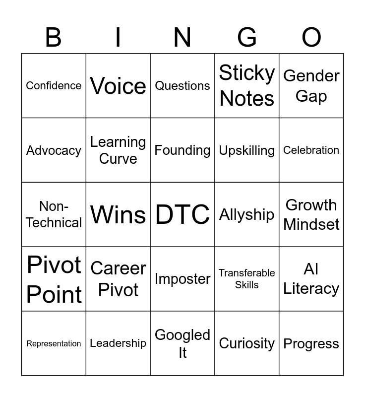 This bingo card has a free space and 24 words: Career Pivot, Leadership, Founding, Representation, Gender Gap, Confidence, Advocacy, Voice, Allyship, Imposter, Upskilling, Non-Technical, Transferable Skills, AI Literacy, Learning Curve, Curiosity, Growth Mindset, Questions, Celebration, Wins, Progress, Pivot Point, Sticky Notes and Googled It.
