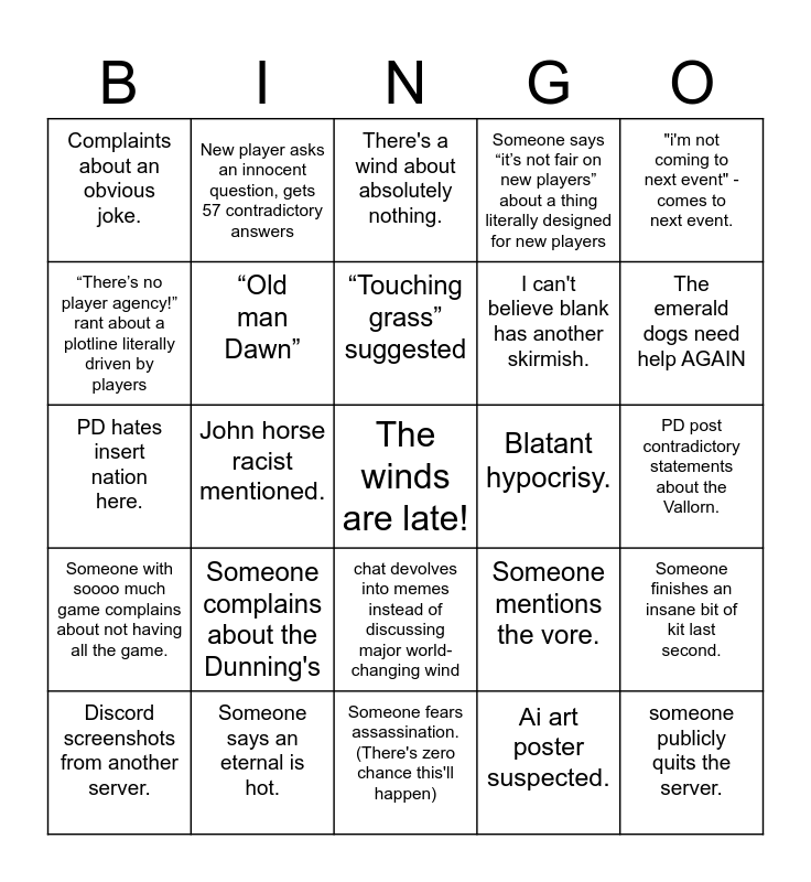 This bingo card has a free space and 29 words: Someone complained about the oathwright., Someone says an eternal is hot., There's a wind about absolutely nothing., “I have zero keen”, "i'm not coming to next event" - comes to next event., Complaints about an obvious joke., “Old man Dawn”, “Touching grass” suggested, Blatant hypocrisy., Someone finishes an insane bit of kit last second., Discord screenshots from another server., John horse racist mentioned., Ai art poster suspected., someone publicly quits the server., PD hates insert nation here., “I'm quitting empire” - doesn't quit empire., Someone fears assassination. (There's zero chance this'll happen), Someone mentions the vore., The emerald dogs need help AGAIN, Someone with soooo much game complains about not having all the game., Someone complains about the Dunning's, Someone complains about a nation getting too much plot., I can't believe blank has another skirmish., PD post contradictory statements about the Vallorn., “There’s no player agency!” rant about a plotline literally driven by players, New player asks an innocent question, gets 57 contradictory answers, chat devolves into memes instead of discussing major world-changing wind, Someone says “it’s not fair on new players” about a thing literally designed for new players and Someone shares a wild conspiracy theory and is 100% correct by accident.