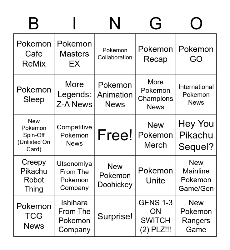 This bingo card has a free space and 24 words: Utsonomiya From The Pokemon Company, Ishihara From The Pokemon Company, Pokemon Animation News, Pokemon TCG News, Pokemon GO, Pokemon Cafe ReMix, Pokemon Sleep, Pokemon Masters EX, New Pokemon Merch, New Pokemon Doohickey, More Pokemon Champions News, New Pokemon Spin-Off (Unlisted On Card), Pokemon Unite, New Mainline Pokemon Game/Gen, More Legends: Z-A News, GENS 1-3 ON SWITCH (2) PLZ!!!, Hey You Pikachu Sequel?, Pokemon Collaboration, International Pokemon News, Competitive Pokemon News, New Pokemon Rangers Game, Creepy Pikachu Robot Thing, Pokemon Recap and Surprise!.