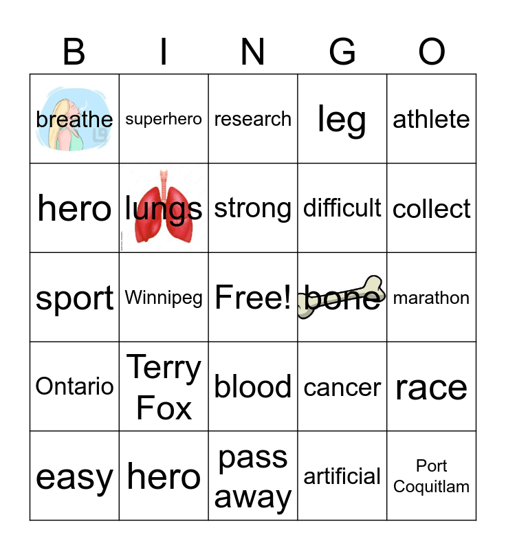 This bingo card has 3 images, a free space and 24 words: Terry Fox, hero, strong, easy, athlete, breathe, hero, superhero, bone, blood, difficult, sport, cancer, race, lungs, artificial, marathon, research, collect, Winnipeg, Port Coquitlam, Ontario, leg and pass away.