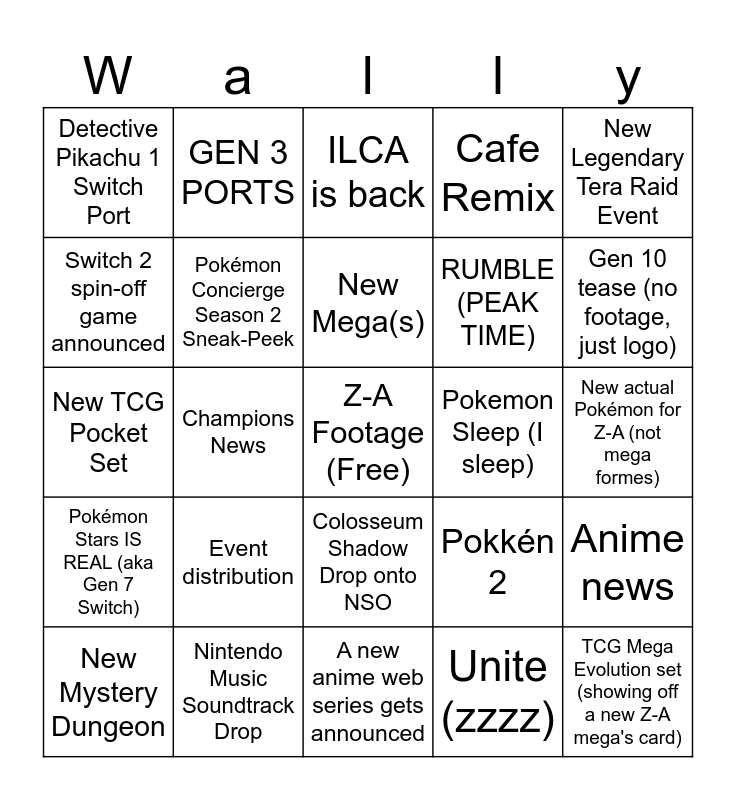 This bingo card has a free space and 24 words: Event distribution, Nintendo Music Soundtrack Drop, New Mega(s), New Mystery Dungeon, New Legendary Tera Raid Event, Detective Pikachu 1 Switch Port, Switch 2 spin-off game announced, GEN 3 PORTS, Pokemon Sleep (I sleep), Colosseum Shadow Drop onto NSO, RUMBLE (PEAK TIME), New TCG Pocket Set, Pokkén 2, Anime news, Pokémon Concierge Season 2 Sneak-Peek, Unite (zzzz), New actual Pokémon for Z-A (not mega formes), ILCA is back, Gen 10 tease (no footage, just logo), Champions News, TCG Mega Evolution set (showing off a new Z-A mega's card), Pokémon Stars IS REAL (aka Gen 7 Switch), Cafe Remix and A new anime web series gets announced.