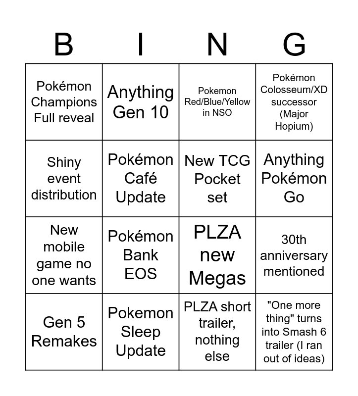 This bingo card has 16 words: Pokemon Sleep Update, 30th anniversary mentioned, Pokemon Red/Blue/Yellow in NSO, Pokémon Champions Full reveal, New mobile game no one wants, Anything Gen 10, PLZA new Megas, PLZA short trailer, nothing else, Shiny event distribution, Pokémon Café Update, Gen 5 Remakes, Pokémon Colosseum/XD successor (Major Hopium), Pokémon Bank EOS, Anything Pokémon Go, New TCG Pocket set and "One more thing" turns into Smash 6 trailer (I ran out of ideas).