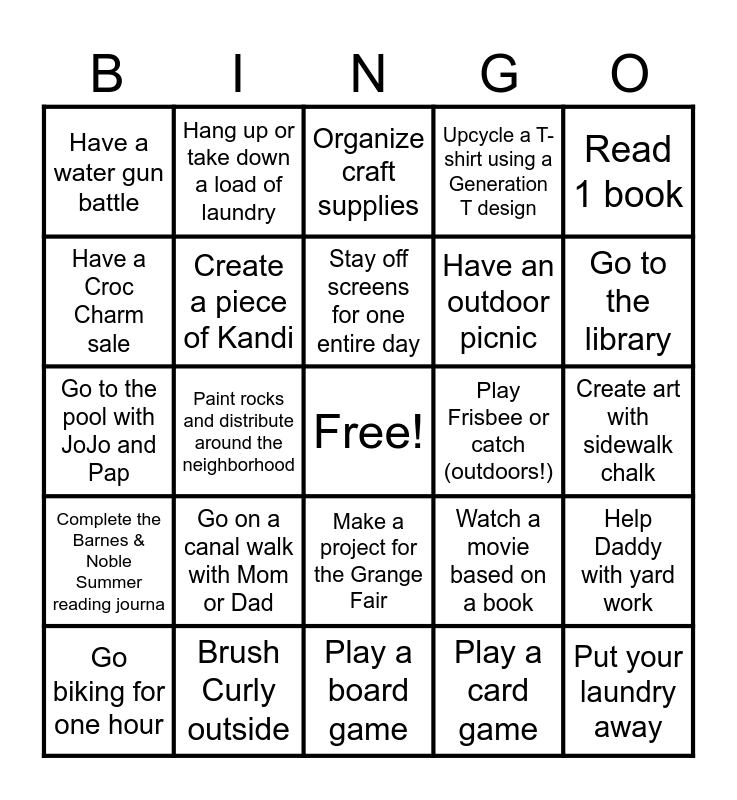 This bingo card has a free space and 24 words: Go on a canal walk with Mom or Dad, Brush Curly outside, Stay off screens for one entire day, Go biking for one hour, Read 1 book, Have a water gun battle, Have a Croc Charm sale, Hang up or take down a load of laundry, Play Frisbee or catch (outdoors!), Make a project for the Grange Fair, Have an outdoor picnic, Go to the pool with JoJo and Pap, Watch a movie based on a book, Help Daddy with yard work, Create a piece of Kandi, Play a card game, Create art with sidewalk chalk, Organize craft supplies, Go to the library, Paint rocks and distribute around the neighborhood, Put your laundry away, Complete the Barnes & Noble Summer reading journa, Upcycle a T-shirt using a Generation T design and Play a board game.