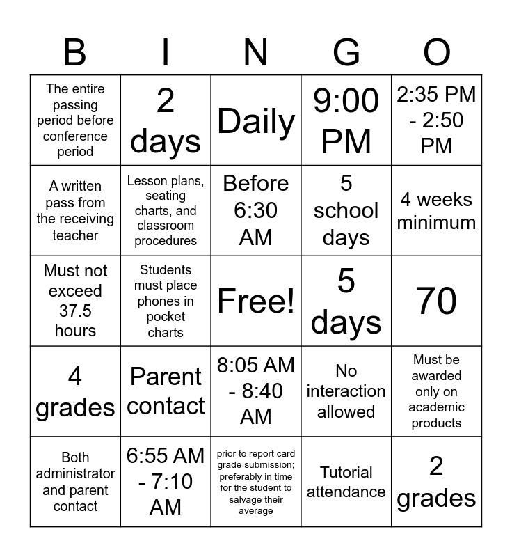 This bingo card has a free space and 31 words: prior to report card grade submission; preferably in time for the student to salvage their average, Your department chair and secretary/Student Support AP, Students must place phones in pocket charts, Each class period, The entire passing period before conference period, Daily, Lesson plans, seating charts, and classroom procedures, No interaction allowed, 5 days, Tutorial attendance, 70, 2 grades, Monday by 7:00 AM, Find coverage, 4 weeks minimum, Passing period duty before conference period, Must be awarded only on academic products, Parent contact, 4 grades, 8:05 AM - 8:40 AM, 2:35 PM - 2:50 PM, At least 2 working days before, Both administrator and parent contact, 2 days, 5 school days, A written pass from the receiving teacher, 9:00 PM, Must not exceed 37.5 hours, 6:55 AM - 7:10 AM, Before 6:30 AM and 7:00 AM - 3:00 PM.