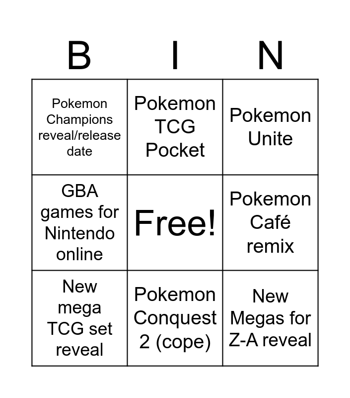 This bingo card has a free space and 8 words: Pokemon Café remix, Pokemon Unite, Pokemon TCG Pocket, New mega TCG set reveal, Pokemon Champions reveal/release date, New Megas for Z-A reveal, GBA games for Nintendo online and Pokemon Conquest 2 (cope).