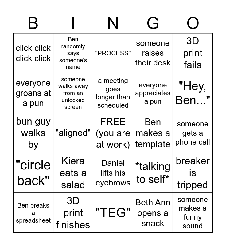 This bingo card has a free space and 44 words: something is run through AI, someone makes a funny sound, someone repeats something, Ben breaks a spreadsheet, Rachel crinkles her nose, Beth Ann opens a snack, "PROCESS", eye contact during a call, 3D print fails, 3D print finishes, someone raises their desk, Ben makes a template, Daniel lifts his eyebrows, Kiera eats a salad, values are mentioned, "TEG", Troy wears only one headphone over his ear, bun guy walks by, sass, "Hey, Ben...", Ben randomly says someone's name, Product Design receives an email, caps in chat, click click click click, a box is given to Beth Ann, someone gets a phone call, another team member enters, a specific reference is made, *talking to self*, "circle back", someone removes their shoes, breaker is tripped, someone borrows tools, "touch base", "aligned", All-HQ chat is pinged, awkward "bye", Rachel discusses violence, a meeting goes longer than scheduled, everyone groans at a pun, everyone appreciates a pun, someone accidentally plays a reel too loud, someone walks away from an unlocked screen and "that smells good".
