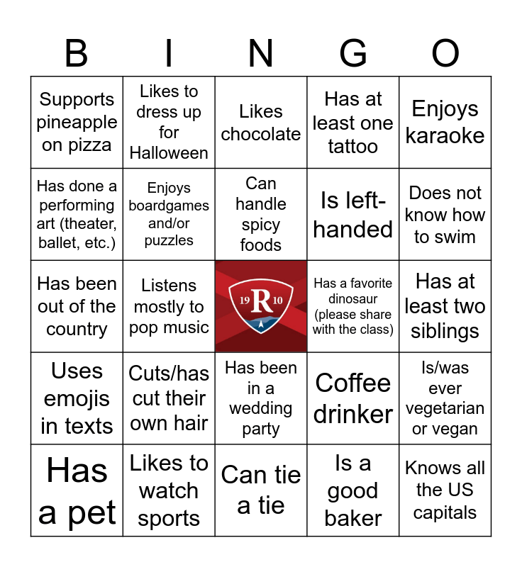 This bingo card has a free space and 25 words: Cuts/has cut their own hair, Can tie a tie, Can handle spicy foods, Has a pet, Enjoys karaoke, Supports pineapple on pizza, Has done a performing art (theater, ballet, etc.), Likes to dress up for Halloween, Has a favorite dinosaur (please share with the class), Has been in a wedding party, Is left-handed, Has been out of the country, Coffee drinker, Is/was ever vegetarian or vegan, Enjoys boardgames and/or puzzles, Plays a musical instrument, Has at least two siblings, Likes chocolate, Does not know how to swim, Listens mostly to pop music, Knows all the US capitals, Likes to watch sports, Uses emojis in texts, Has at least one tattoo and Is a good baker.