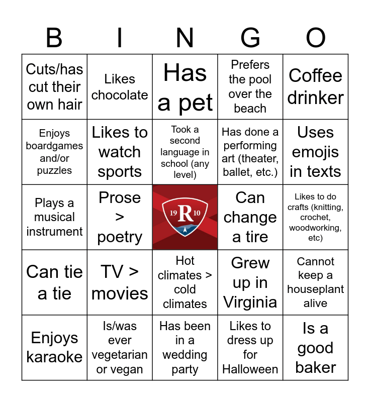 This bingo card has a free space and 25 words: TV > movies, Has been in a wedding party, Took a second language in school (any level), Enjoys karaoke, Coffee drinker, Cuts/has cut their own hair, Enjoys boardgames and/or puzzles, Likes chocolate, Can change a tire, Hot climates > cold climates, Has done a performing art (theater, ballet, etc.), Plays a musical instrument, Grew up in Virginia, Cannot keep a houseplant alive, Likes to watch sports, Has at least two siblings, Likes to do crafts (knitting, crochet, woodworking, etc), Has a pet, Uses emojis in texts, Prose > poetry, Is a good baker, Is/was ever vegetarian or vegan, Can tie a tie, Prefers the pool over the beach and Likes to dress up for Halloween.