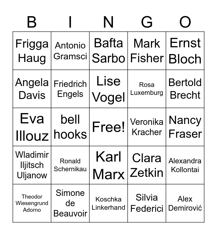 This bingo card has a free space and 24 words: Ronald Schernikau, Simone de Beauvoir, Lise Vogel, Theodor Wiesengrund Adorno, Ernst Bloch, Frigga Haug, Angela Davis, Antonio Gramsci, Veronika Kracher, Karl Marx, Rosa Luxemburg, Eva Illouz, Clara Zetkin, Alexandra Kollontai, Friedrich Engels, Silvia Federici, Nancy Fraser, Bafta Sarbo, Bertold Brecht, bell hooks, Alex Demirović, Wladimir Iljitsch Uljanow, Mark Fisher and Koschka Linkerhand.