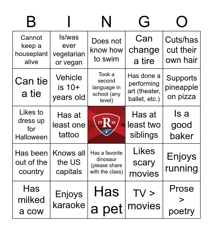 This bingo card has a free space and 25 words: Knows all the US capitals, Has a pet, Took a second language in school (any level), Has milked a cow, Cuts/has cut their own hair, Cannot keep a houseplant alive, Can tie a tie, Is/was ever vegetarian or vegan, Has at least two siblings, Has a favorite dinosaur (please share with the class), Has done a performing art (theater, ballet, etc.), Likes to dress up for Halloween, Likes scary movies, Enjoys running, Vehicle is 10+ years old, Has been in a wedding party, Is a good baker, Does not know how to swim, Supports pineapple on pizza, Has at least one tattoo, Prose > poetry, Enjoys karaoke, Has been out of the country, Can change a tire and TV > movies.