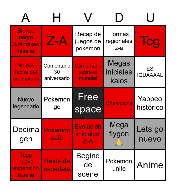 This bingo card has a free space and 24 words: Pokemon cafe, Raids de escarlata, Comentario sobre el mundial, Tcgp nueva expansión teselia, Tcg, Blanco negro 3/remakes teselia, No hay fecha del champions, Z-A, Champions, Evolución iniciales Z-A, Megas iniciales kalos, Nuevo legendario, Mega flygon 🙏, Lets go nuevo, Comentario 30 aniversario, Pokemon unite, Yappeo histórico, Recap de juegos de pokemon, ES IGUAAAAL, Pokemon go, Anime, Decima gen, Formas regionales z-a and Begind de scene.