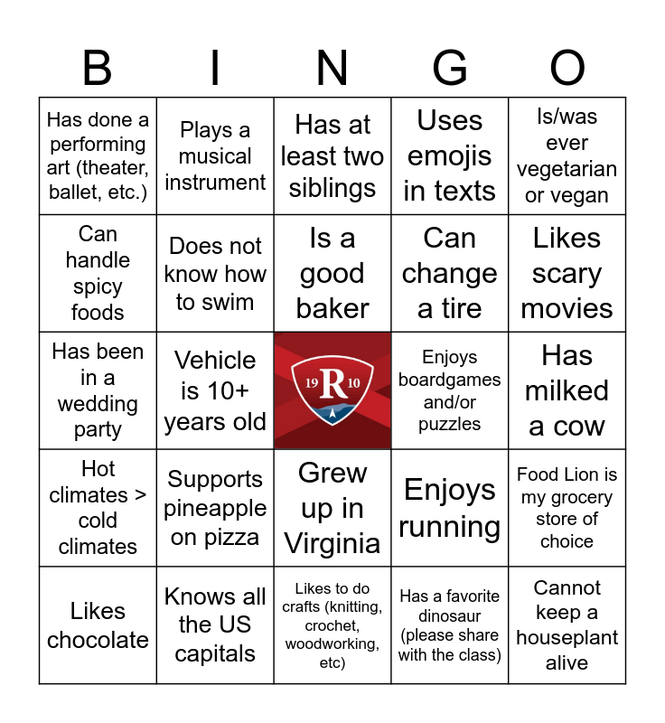This bingo card has a free space and 25 words: Supports pineapple on pizza, Likes to do crafts (knitting, crochet, woodworking, etc), Is a good baker, Likes chocolate, Is/was ever vegetarian or vegan, Has done a performing art (theater, ballet, etc.), Can handle spicy foods, Plays a musical instrument, Enjoys boardgames and/or puzzles, Grew up in Virginia, Can change a tire, Has been in a wedding party, Enjoys running, Food Lion is my grocery store of choice, Does not know how to swim, Cuts/has cut their own hair, Has milked a cow, Has at least two siblings, Likes scary movies, Vehicle is 10+ years old, Cannot keep a houseplant alive, Knows all the US capitals, Hot climates > cold climates, Uses emojis in texts and Has a favorite dinosaur (please share with the class).