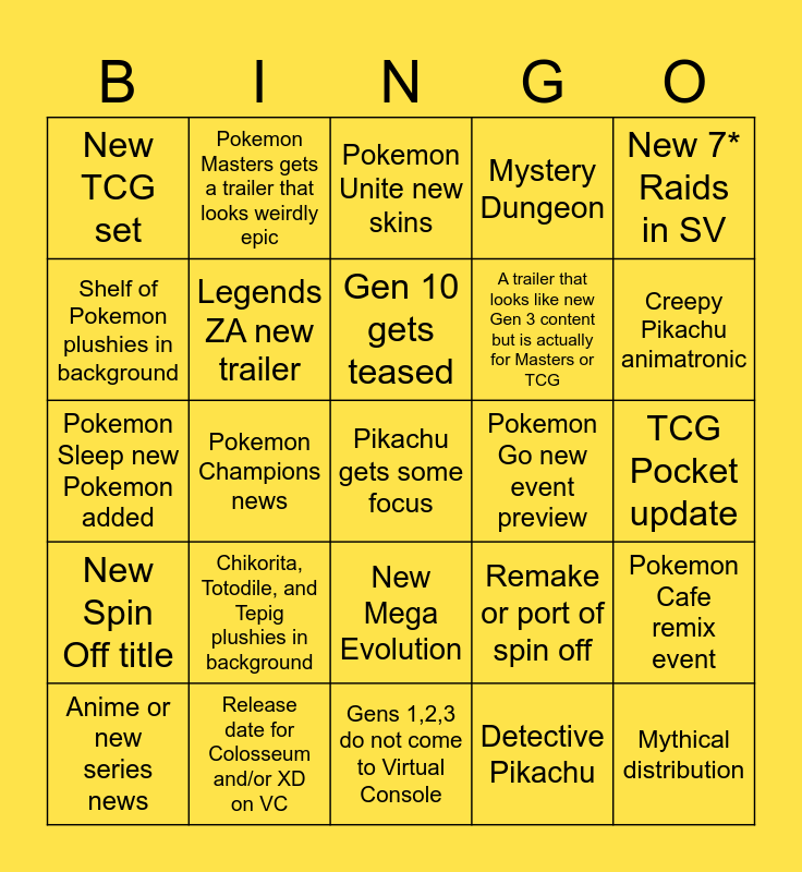 This bingo card has a free space and 24 words: Anime or new series news, Chikorita, Totodile, and Tepig plushies in background, Gen 10 gets teased, Detective Pikachu, New 7* Raids in SV, New TCG set, Pokemon Masters gets a trailer that looks weirdly epic, Pokemon Unite new skins, Pokemon Go new event preview, TCG Pocket update, Pokemon Sleep new Pokemon added, Legends ZA new trailer, Remake or port of spin off, Pokemon Cafe remix event, Shelf of Pokemon plushies in background, Release date for Colosseum and/or XD on VC, Gens 1,2,3 do not come to Virtual Console, Mystery Dungeon, Creepy Pikachu animatronic, New Spin Off title, Pokemon Champions news, New Mega Evolution, A trailer that looks like new Gen 3 content but is actually for Masters or TCG and Mythical distribution.