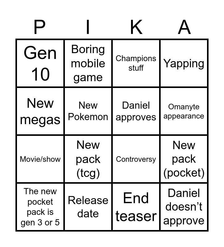 This bingo card has 16 words: Release date, New pack (pocket), Champions stuff, Gen 10, Movie/show, Boring mobile game, Controversy, End teaser, New megas, New Pokemon, The new pocket pack is gen 3 or 5, Yapping, New pack (tcg), Omanyte appearance, Daniel approves and Daniel doesn’t approve.