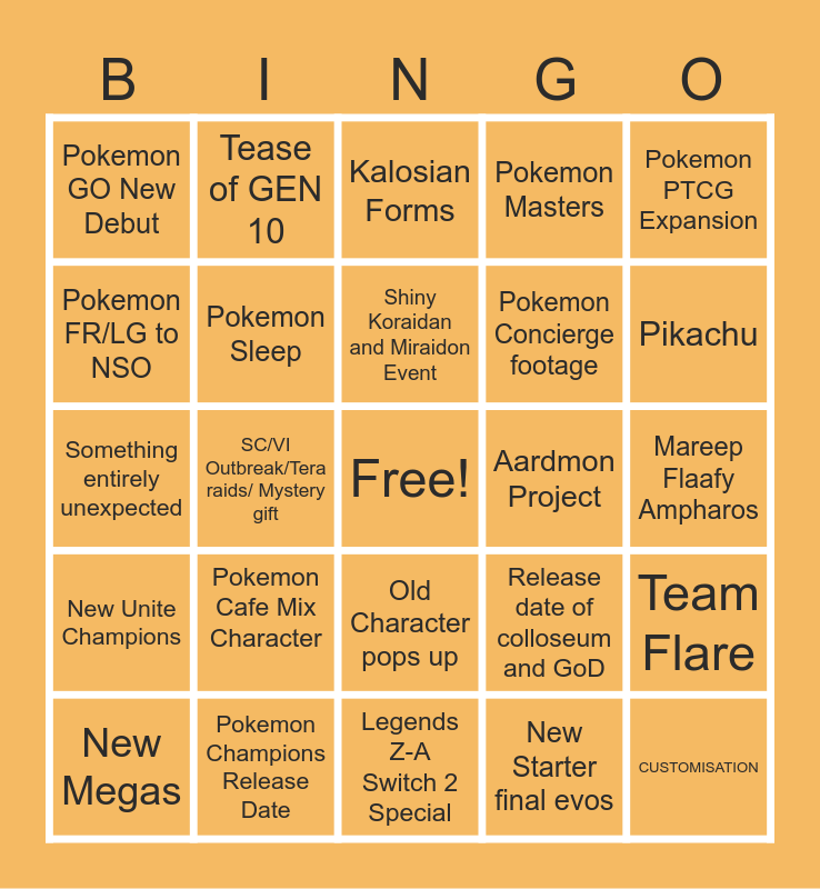 This bingo card has a free space and 24 words: Pokemon Cafe Mix Character, Pokemon Champions Release Date, Shiny Koraidan and Miraidon Event, New Megas, Pokemon PTCG Expansion, Pokemon GO New Debut, Pokemon FR/LG to NSO, Tease of GEN 10, Aardmon Project, Old Character pops up, Pokemon Concierge footage, Something entirely unexpected, Release date of colloseum and GoD, Team Flare, Pokemon Sleep, New Starter final evos, Mareep Flaafy Ampharos, Kalosian Forms, Pikachu, SC/VI Outbreak/Tera raids/ Mystery gift, CUSTOMISATION, New Unite Champions, Pokemon Masters and Legends Z-A Switch 2 Special.