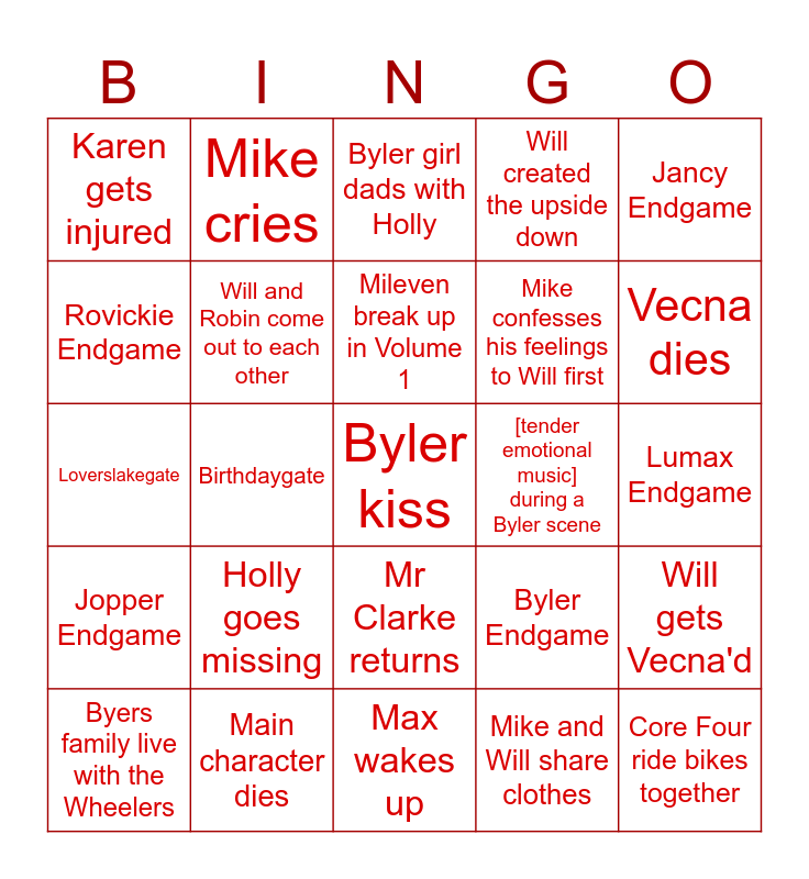 This bingo card has 25 words: Holly goes missing, Max wakes up, Mileven break up in Volume 1, Byers family live with the Wheelers, Jancy Endgame, Karen gets injured, Rovickie Endgame, Mike cries, [tender emotional music] during a Byler scene, Mr Clarke returns, Mike confesses his feelings to Will first, Loverslakegate, Byler Endgame, Will gets Vecna'd, Will and Robin come out to each other, Core Four ride bikes together, Lumax Endgame, Byler girl dads with Holly, Vecna dies, Birthdaygate, Byler kiss, Main character dies, Jopper Endgame, Will created the upside down and Mike and Will share clothes.