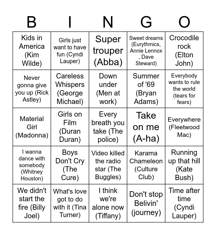 This bingo card has 25 words: Boys Don't Cry (The Cure), I think we're alone now (Tiffany), Down under (Men at work), We didn't start the fire (Billy Joel), Crocodile rock (Elton John), Kids in America (Kim Wilde), Never gonna give you up (Rick Astley), Girls just want to have fun (Cyndi Lauper), Take on me (A-ha), Video killed the radio star (The Buggles), Summer of '69 (Bryan Adams), Material Girl (Madonna), Karama Chameleon (Culture Club), Running up that hill (Kate Bush), Careless Whispers (George Michael), Time after time (Cyndi Lauper), Everywhere (Fleetwood Mac), Super trouper (Abba), Everybody wants to rule the world (tears for fears), Girls on Film (Duran Duran), Every breath you take (The police), What's love got to do with it (Tina Turner), I wanna dance with somebody (Whitney Houston), Sweet dreams (Eurythmics, Annie Lennox , Dave Steward) and Don't stop Belivin' (journey).